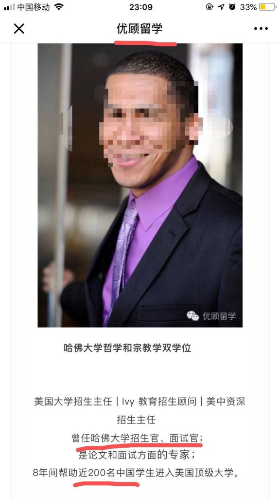 这位仁兄一出场就很吓人,头衔是美国大学招生主任,不知道是不是指American University。曾任哈佛大学招生官,面试官,8年时间帮助近200名中国学生进入美国顶级大学。可是哈佛大学北京校友会说是2015届毕业的啊,这位老兄已经工作8年了,并且服务了200名中国学生。08年,在国内中介中,应该还没有任何一家机构打“前招生官”牌,那年观察君刚入行,整个行业的美本业务都处于刚起步阶段。